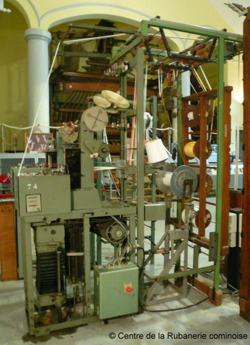Métier à aiguilles 2 bandes. Le métier est équipé pour tisser du ruban élastique, des chaînons d'armure déterminent le dessin.