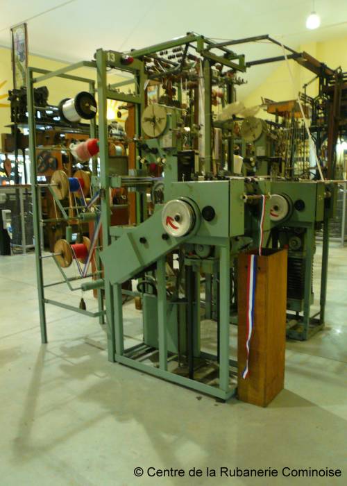 Métier à aiguilles 2 bandes. L'insertion de la trame entre les fils de chaîne est faite par l'aiguille de trame. Une aiguille à clapet retient la trame par le procédé dit de maillage. Des cames déterminent la contexture du ruban.