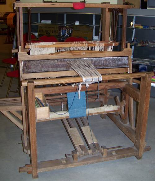 Métier traditionnel de basse lisse à 4 cadres et pédales, ourdi pour réaliser un ruban d’environ 20 cm de lisière.