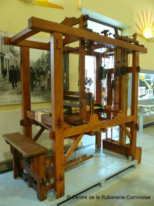 Réplique d'un métier ancien avec passage manuel de la navette de trame entre les fils de chaîne. Ces derniers ne sont pas enroulés sur ensouple mais pendent en boucle à l’arrière du métier. Le métier est agencé de manière à produire de la toile : le mouvement des lames est entraîné par deux pédales qu’actionne le tisserand assis sur un banc. La construction de la réplique a été commanditée par Simon Vanhée, fondateur du musée de la Rubanerie de Comines, pour cette institution. Le métier a un temps été déplacé sur un char lors de la fête annuelle des marmousets, pratique qui a été interrompue pour la bonne conservation du métier. Sa simplicité de fonctionnement permet à tous d’assimiler aisément les principes de base du tissage. Il arrive qu’il soit prêté pour des expositions temporaires en raison de son aspect didactique.