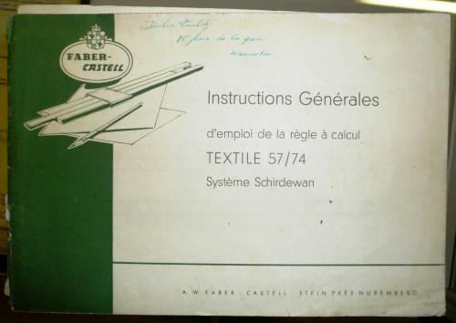 Mode d’emploi de la règle à calcul MRc 899 permettant, grâce à une molette mobile, de réaliser des conversions mathématiques visant à déterminer le titrage d’un fil.