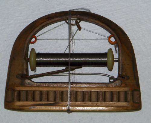 La crémaillère de la navette se trouve dans le haut de celle-ci. Ici, la canette est dite “pipe à joues” car la matière qu’elle contient (un fil de nylon) est extrêmement vivace et doit être contenue.