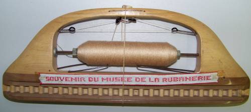 Cette navette s’est vu coller sur sa face postérieure, un petit ruban jacquard portant les inscriptions : “SOUVENIR DU MUSEE DE LA RUBANERIE”.
