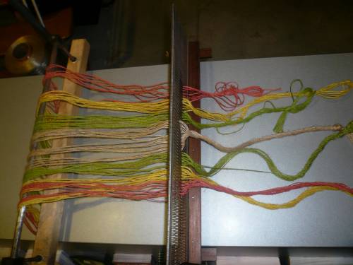 Présentation didactique d’un ensemble de fils de chaîne passant par un porte-fil et un peigne envergeur (séparant les fils pairs et impairs de la chaîne).