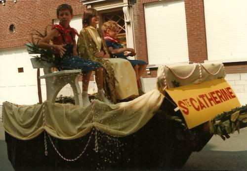 Photographie argentique couleur réalisée le dimanche 17 juillet 1983 à l’occasion de la première “Fête des Marmousets” dont l’origine remonte au Moyen Âge, au moment où les tisserands cominois célébraient sainte Anne, leur patronne. En 1983, Simon Vanhée, fondateur du Musée de la Rubanerie cominoise, aidé par l’Echevin de la Culture et le Comité des Fêtes du Centre de Comines-Belgique, mit sur pied un cortège dédié à la mémoire textile de l’entité. Le cliché représente le char de sainte Catherine d’Alexandrie, sainte patronne des rubaniers cominois.