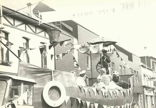 Le cliché représente le char des Gais Lurons (groupe du Comité des Fêtes du hameau du Gheer, dans l’entité de Comines-Warneton), dans la rue du Fort.