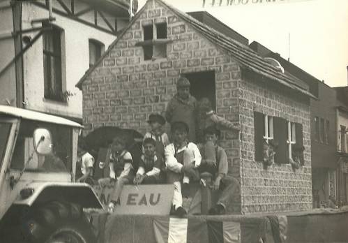Le cliché représente le char du moulin à eau accompagné de marmousets, dans la rue du Fort.