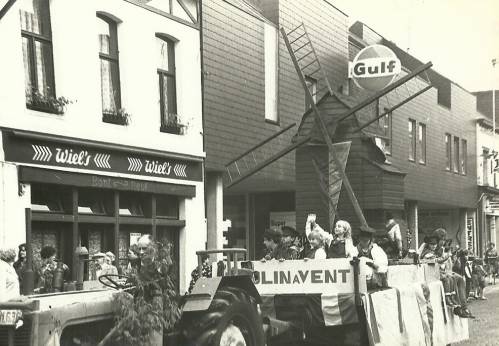 Le cliché représente le char du moulin à vent du hameau cominois de Ten-Brielen entouré de marmousets, dans la rue du Fort.