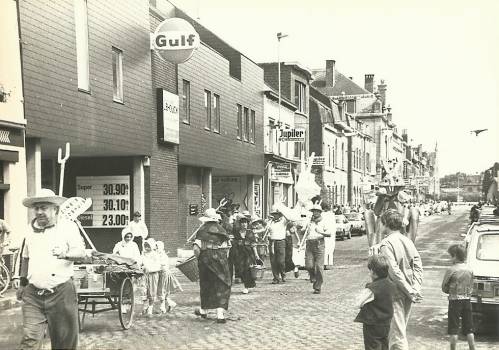 Le cliché représente le groupe des “Cinsis” (ou “fermiers”, en picard) du quartier cominois du Godshuys, suivis de leur mascotte, le lapin géant, pérégrinant dans la rue du Fort.