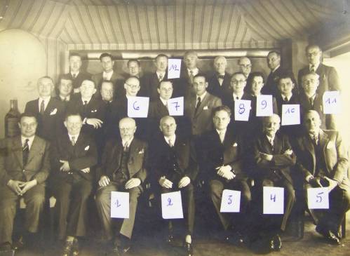 Photographie de groupe du personnel responsable de l’usine Ducarin, ponctuée de numéros inscrits au stylo à bille sur des étiquettes autocollantes.