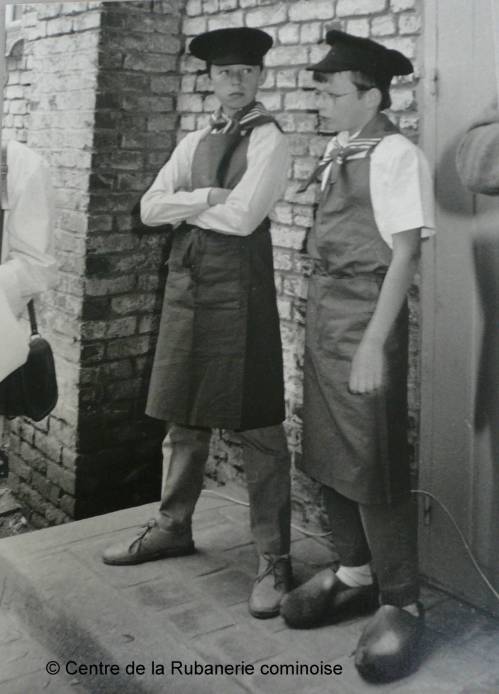Deux marmousets (apprentis rubaniers) dans la tenue traditionnelle.
