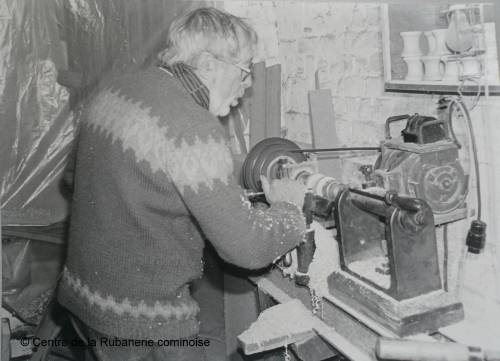 Simon Vanhée, conservateur du musée de la rubanerie, façonne sur un tour à bois les éléments qui garniront le métier à barre.