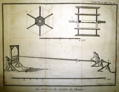 Planche gravée issue de l’ouvrage de l’abbé Pluche “Le Spectacle de la nature ou entretiens sur les particularités de l’histoire naturelle qui ont paru les plus propres à rendre les jeunes gens curieux et à leur former l’esprit”, tirée du volume VI (planche XXI), représentant, sur deux niveaux, un appareil à ourdir la chaîne d’un métier à tisser, accosté de deux travailleurs en action (le premier tourne une chignole, le second place un peigne envergeur), ponctué de numéros renvoyant au texte descriptif.