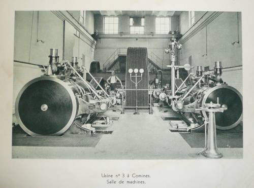 Planche imprimée en noir et blanc présentant la salle des machines de l’usine FFF n°3 à Comines (anciennes filteries Hassebrouck) en 1920.