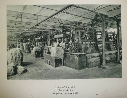 Planche imprimée en noir et blanc présentant la salle de peignage de lin de l’usine FFF n°1 à Lille (anciens Etablissements Poullier-Longhaye) en 1920.