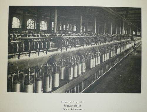 Planche imprimée en noir et blanc présentant la salle des bacns à broches de la filature de lin de l’usine FFF n°1 à Lille (anciens Etablissements Poullier-Longhaye) en 1920.
