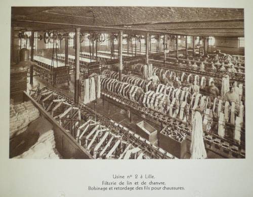 Planche imprimée en noir et blanc présentant la salle des bancs à broches de la filature de lin et de chanvre de l’usine FFF n°2 à Lille (anciens Etablissements H. et L. Rogez) en 1920.