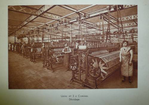 Planche imprimée en sépia présentant la salle de dévidage de l’usine FFF n°3 à Comines (anciennes filteries Hassebrouck) en 1920.