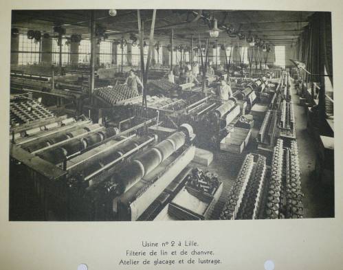 Planche imprimée en noir et blanc présentant la salle de glaçage et de lustrage de la filature de lin et de chanvre de l’usine FFF n°2 à Lille (anciens Etablissements H. et L. Rogez) en 1920. 16 ouvriers (dont 2 hommes) posent derrière leurs métiers. Une mention sur trois lignes identifie le lieu et sa fonction.
