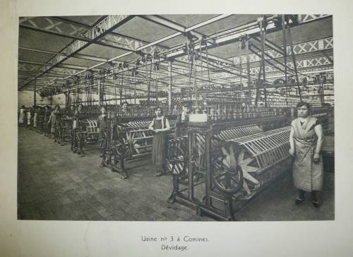 Planche imprimée en sépia présentant la salle de retordage de l’usine FFF n°3 à Comines (anciennes filteries Hassebrouck) en 1920.