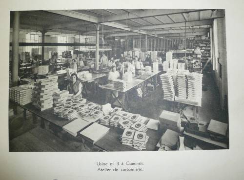 Planche imprimée en noir et blanc présentant la salle de conditionnement (cartonnage) de l’usine FFF n°3 à Comines (anciennes filteries Hassebrouck) en 1920.