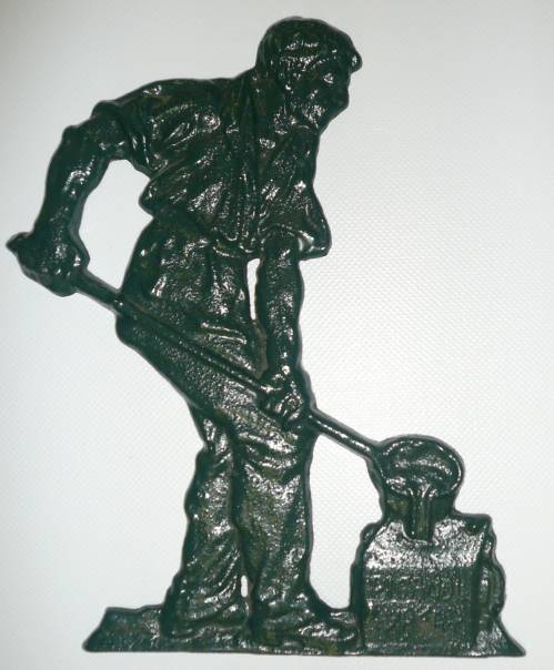 Plaque décorative d’un métier à tisser “Président” de la firme Picanol. L’élément en fonte coulée et peinte représente un fondeur au travail. Dans le coin inférieur droit est notée l’inscription “Picanol Yper”.