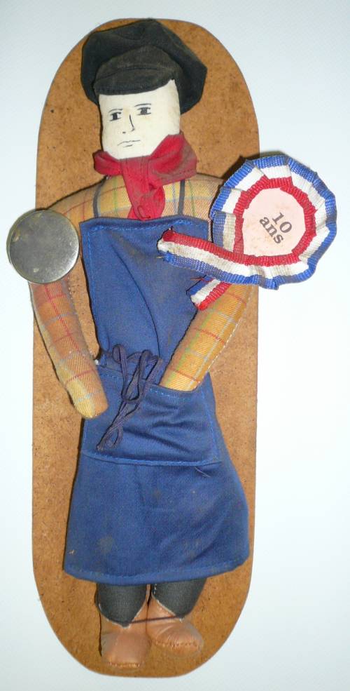 Poupée marmouset créée à l’occasion des 10 ans du Musée de la Rubanerie cominoise. L’effigie est fixée sur une plaque de bois afin de servir de décor mural.
