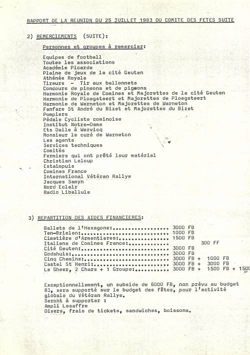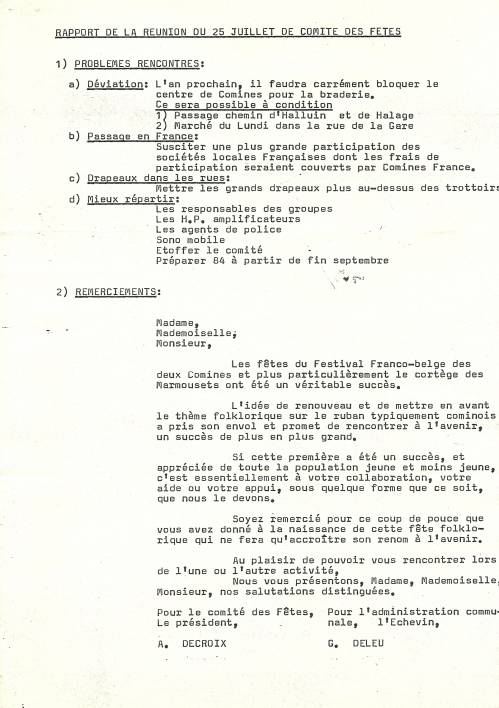 Procès-verbal, en deux pages, de la réunion du Comité des Fêtes de Comines, le 25 juillet 1983.