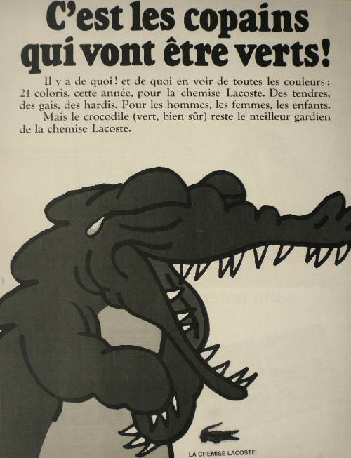 Publicité en noir et blanc issue d’un illustré d’époque, vantant les mérites de la chemise “Lacoste”, accompagnée du slogan de la marque et d’un texte promotionnel.