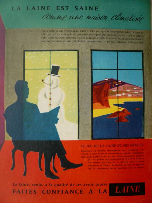 Publicité en couleurs issue d’un illustré d’époque, vantant les mérites de la laine naturelle, accompagné du slogan “Faites confiance à la laine” et d’un texte promotionnel.