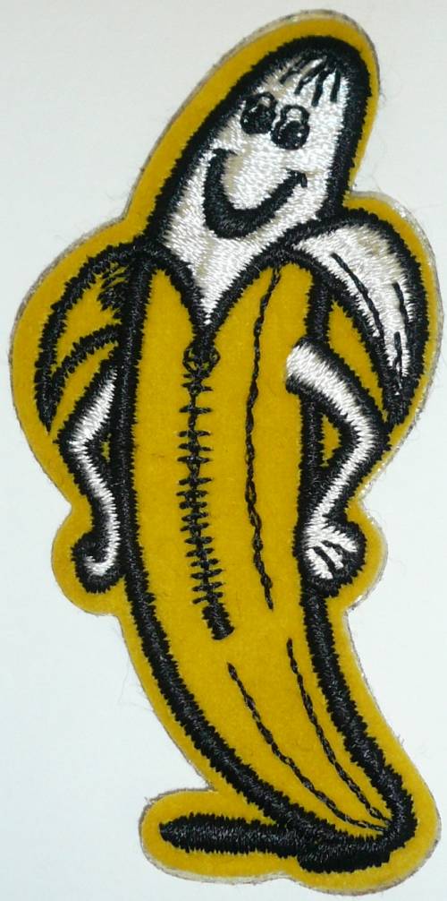 Ruban de feutrine tissé au jacquard et découpé à l’emporte-pièce représentant, an jaune, blanc et noir, un personnage en forme de banane.