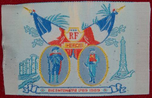 Ruban jacquard multicolore célébrant le bicentenaire de la Révolution Française de 1789, portant, sous deux drapeaux français affrontés avec nuages et palmes autour d’un écusson marqué du chiffre “RF” sous trois étoiles, deux cartouches dans lesquels sont inscrit des militaires.