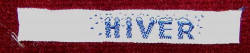 Ruban tissé au jacquard comportant, sur fond blanc, la mention “HIVER” entourée de flocons de neiges, le tout de couleur bleue.