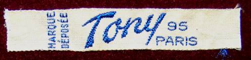 Ruban tissé au jacquard présentant, en bleu sur fond blanc, sur plusieurs lignes, les inscriptions : “MARQUE; DEPOSEE; Tony; 95; PARIS”.