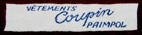 Ruban tissé au jacquard comportant, en bleu sur fond blanc, l’inscription sur trois lignes : “VÊTEMENTS; Coupin; PAIMPOL”.