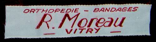 Ruban tissé au jacquard comportant, en rouge sur fond blanc et sur trois lignes, les inscriptions : “ORTHOPEDIE-BANDAGES; R. Moreau; -VITRY-”.
