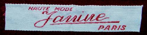 Ruban tissé au jacquard présentant, en rouge sur fond blanc, les inscriptions sur trois lignes : “HAUTE MODE; Janine; PARIS”.