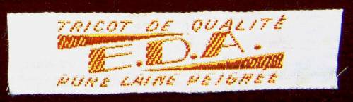 Ruban tissé au jacquard présentant sur trois lignes, en orange sur fond blanc, les inscriptions : TRICOTS DE QUALITE; E.D.A.; PURE LAINE PEIGNEE”.