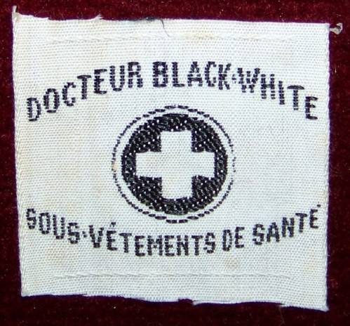 Ruban tissé au jacquard comportant, en bleu marine sur fond blanc, les inscriptions sur deux lignes “DOCTEUR BLACK-WHITE; SOUS-VETEMENTS DE SANTE” réparties autour d’un oculus frappé d’une croix grecque blanche sur fond bleu.