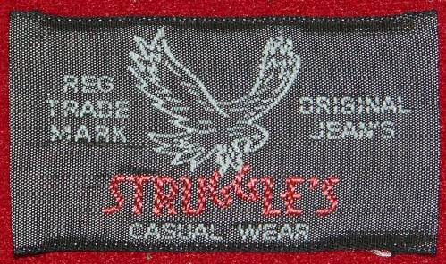 D’autres inscriptions au fil blanc, autour de la figure, précisent : “REG; TRADE MARK; ORIGINAL; JEAN’S; CASUAL WEAR”.