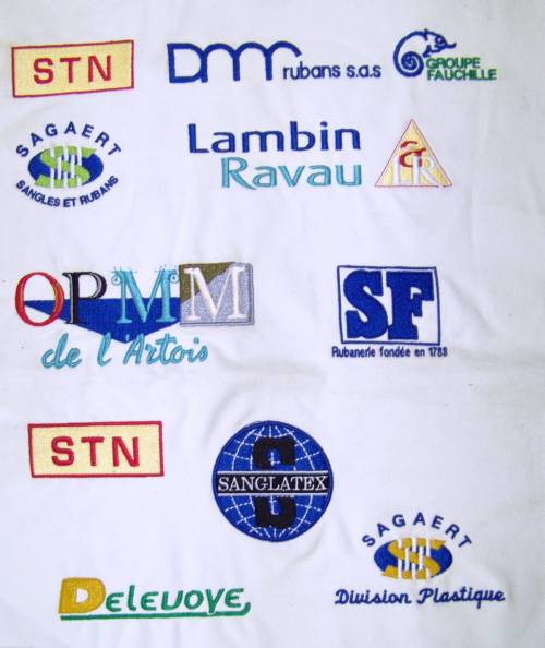 Ruban tissé au jacquard comportant, sur plusieurs lignes, les inscriptions et logos des firmes du groupe Géry Fauchille : “STN, DMR rubans S.A.A.; Groupe Fauchille; Sagaert sangles et rubans; Lambin Ravau; OPMM de l’Artois; SF Rubanerie fondée en 1788; STN; Sanglatex; Delevoye; Sagaert Division Plastique”.