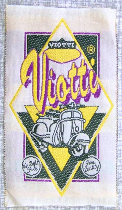Ruban tissé au jacquard comportant, sur fond blanc, un rectangle au liseré mauve et blanc sur fond brun, lui-même frappé d’un triangle au liseré jaune avec, inscrites en jaune, vert, mauve et blanc, les mentions : “VIOTTI” en lettres capitales et en cursives, surmontant la représentation d’un vélomoteur de type “Vespa”.