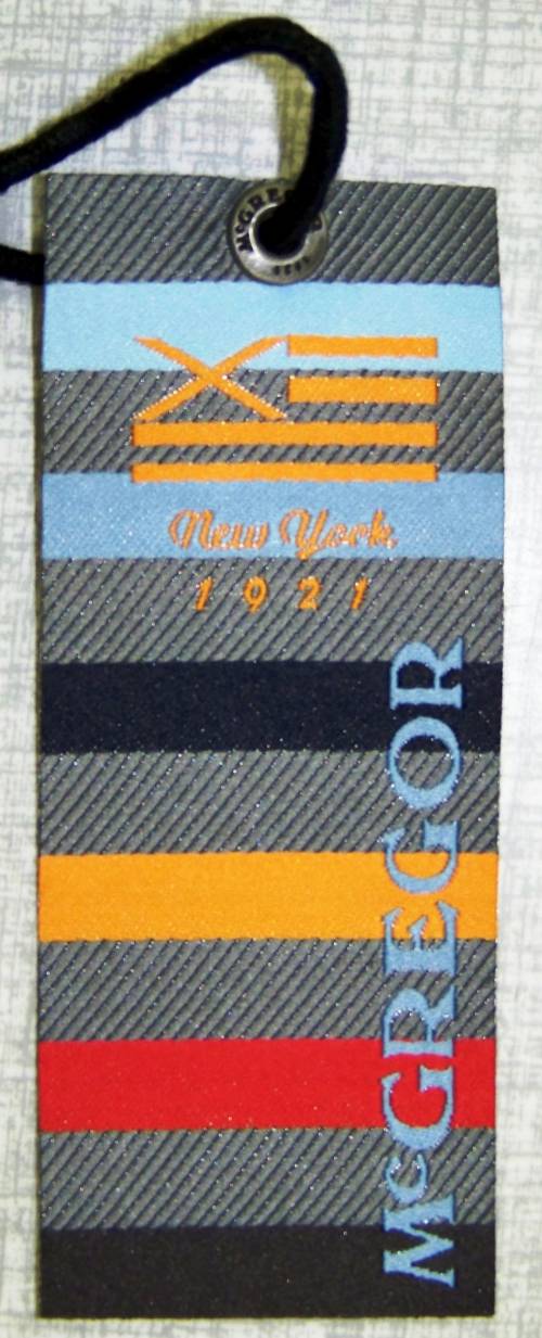Ruban multicolore tissé au jacquard, comportant, en bleu, l’inscription verticale “Mc GREGOR” et en orange un logo figurant un drapeau suivi des inscriptions : “New York; 19221”.