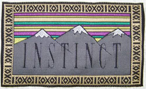 Ruban tissé au jacquard comportant, sur fond noir, un cartouche au liseré géométrique, frappé d’un paysage à trois pics montagneux enneigés surmontés de lignes horizontales multicolores et portant la mention “INSTINCT”.