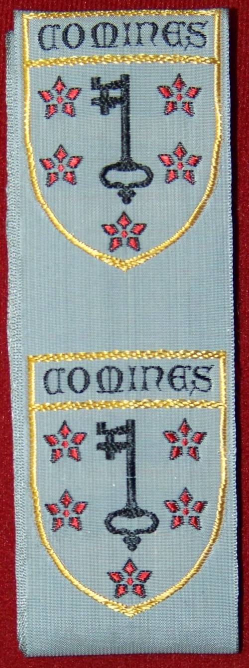 Mateau de ruban tissé au jacquard portant, dans un écu au liseré d’or, les armoiries de Comines (France) : “D’argent à une clef de sable mise en pal, le panneton en haut et à dextre, et accompagnée de cinq quintefeuilles de gueules, deux à dextre, deux à senestre et une en pointe”.