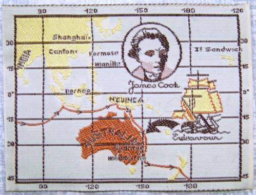 Ruban tissé au jacquard comportant, sur fond beige, un carroyage (parallèles et méridiens avec anotations mathématiques) et un cartouche noirs, ce dernier étant frappé d’un portrait identifié par la mention “James Cook”.