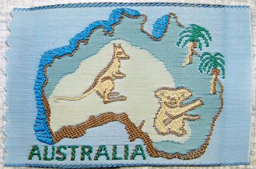 Ruban tissé au jacquard comportant, en vert, bleu, brun et beige, sur fond parme, l’inscription “AUSTRALIA” accompagnée de la silhouette de l’Australie, frappée d’un kangourou, d’un koala et de deux palmiers.