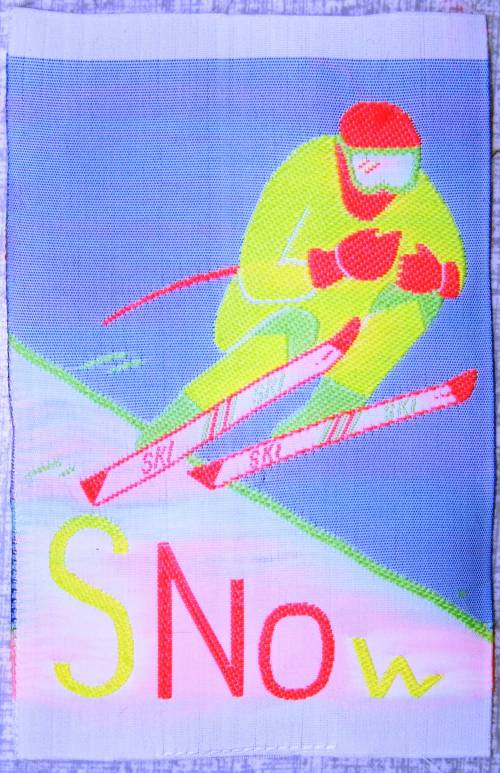 Ruban tissé au jacquard comportant, en jaune, rose fluorescent, vert, blanc et parme, l’effigie d’un skieur alpin au coeur même de l’effort, accompagné de la mention “SNOW”.