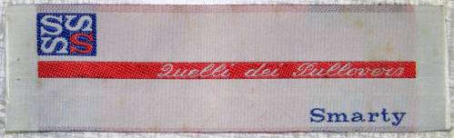 Ruban tissé au jacquard comportant, en bleu, blanc et rouge sur fond blanc, un logo formé de quatre “S” inclus dans un carré, souligné d’une bande rouge frappée de la mention, en italien, “Quelli di pullovera”, souligné, dans le coin inférieur droit de la pièce, de la mention “Smarty”.
