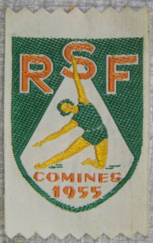 Ruban tissé au jacquard comportant, en vert, orange et or sur fond blanc, un écusson frappé des inscriptions sur plusieurs lignes “R S F ; COMINES; 1955” entourant une gymnaste en train d’exécuter une figure de style.